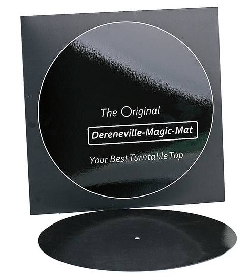 Dereneville Magic MatEinfach anzuwendendes Klangtuningfür alle Plattenteller mit 30cm Durchmesser Die original Dereneville-Magic-Mat optimiert das Resonanzverhalten der Schallplatte und sorgt für eine deutlich verringerte Mikrobewegung der Schallplatte auf dem Plattenteller. Sie wirkt den störenden Mikroresonanzen, die gerade bei dünneren Schallplatten entstehen, entgegen. Dank der hervorragenden Hafteigenschaften stellt sie eine perfekte Verbindung zwischen Schallplatte und Teller her. Die Folge: Verbesserung der Tiefbasswiedergabe und ein akustisch aufgeräumteres Klangbild. Die Tiefenstaffelung der Bühne nimmt zu. Die Dereneville Magic Mat ist antistatisch. Dadurch gibt es keine Aufladungen. Eventuell vorhandener Staub von der Schallplatte bleibt an der Matte haften und wird nicht auf die Schallplatte übertragen. Ausserdem ist die Magic Mat antibakteriell und lässt sich mit einem Schwamm sehr leicht unter fließendem Wasser reinigen. Hergestellt wird die Dereneville Magic Mat aus einem mit Silikon beschichteten, hochfesten Glasgewebe mit einer Stärke von 0,38mm. Dadurch kann eine Höhenanpassung des Tonarms entfallen.