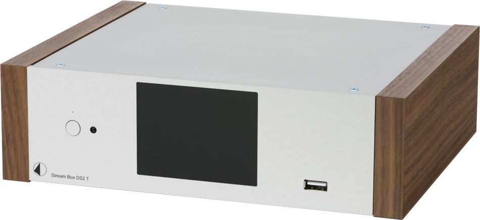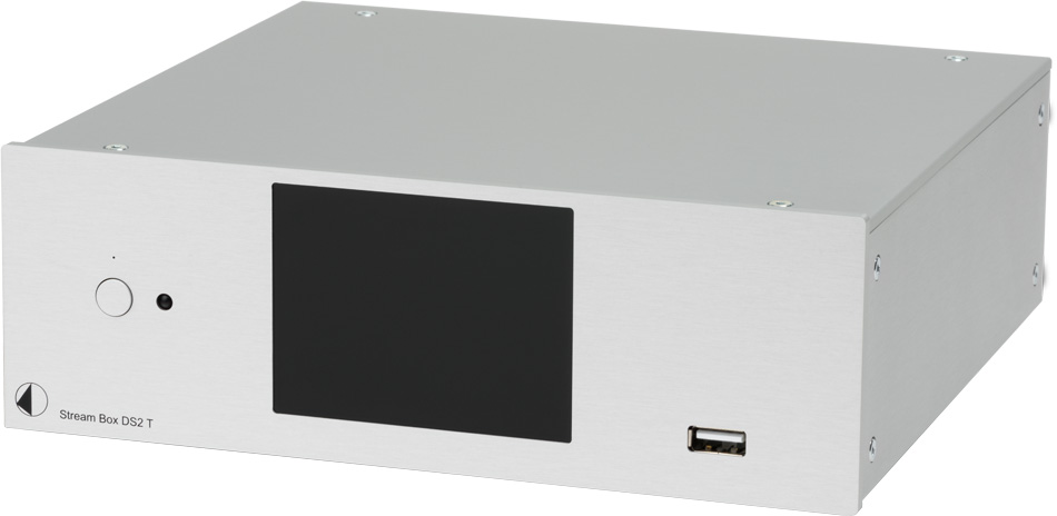 Pro-Ject Stream Box DS2 T24bit/192kHz Hires Audio Streamer & Internetradio Transport• 24 bit/192kHz Hires Audio Streamer • Spotify Connect Unterstützung • Verlustfreies TIDAL Streaming • WAV, AIFF, FLAC, WMA9 lossless, ALAC & AAC • FLAC Dekodierung für alle 9 Kompressionsstufen inklusive Stufe 0 (Datenrate bis etwa 9 mbit/s) • Gapless Wiedergabe aller Audioformate • Coax und optischer digital Ausgang • Suchfunktion mit schnellem Vor– und Rücklauf • Alphanumerische Suche • 3,5“ Farbdisplay zeigt Coverart und Metadaten • Vielsprachige Menütextanzeige • Wifi 802.11 b/g für echtes 24/192 per Wifi • Vollmetallgehäuse verhindert Einstreuungen • Proprietäres NetAPI für schnelle, zuverlässige Steuerung • Verfügbar in silber oder schwarz Die Stream Box DS2 T ist ein voll ausgestatteter Audio Streaming Client mit Internet Radio, welcher es ermöglicht Musik von Netzwerk Servern (wie PCs, NAS Festplatten, etc) abzuspielen welche sich in Ihrem Netzwerk befinden. Stream Box DS2 T bietet hervorragende audiophile Features. Streaming Dienste wie Spotify oder TIDAL können ebenso verwendet werden. Andere Streaming Anbieter, wie Deezer, Grooveshark etc können über Drittanbieter Software eingebunden werden. Superlative Audio Wiedergabe inclusive 24bit HD Musik verstehen sich als selbstverständlich, ebenso liefert Stream Box DS2 T überlegene Resultate im Bereich Verzerrungen und Geräusch Level. Die Navigation erfolgt über die mitgelieferte IR Fernbedienung. Stream Box DS2 T kommt in elegantem Aluminium Gehäuse in silber oder schwarz, optional stehen Holz Seitenteile zur Auswahl.